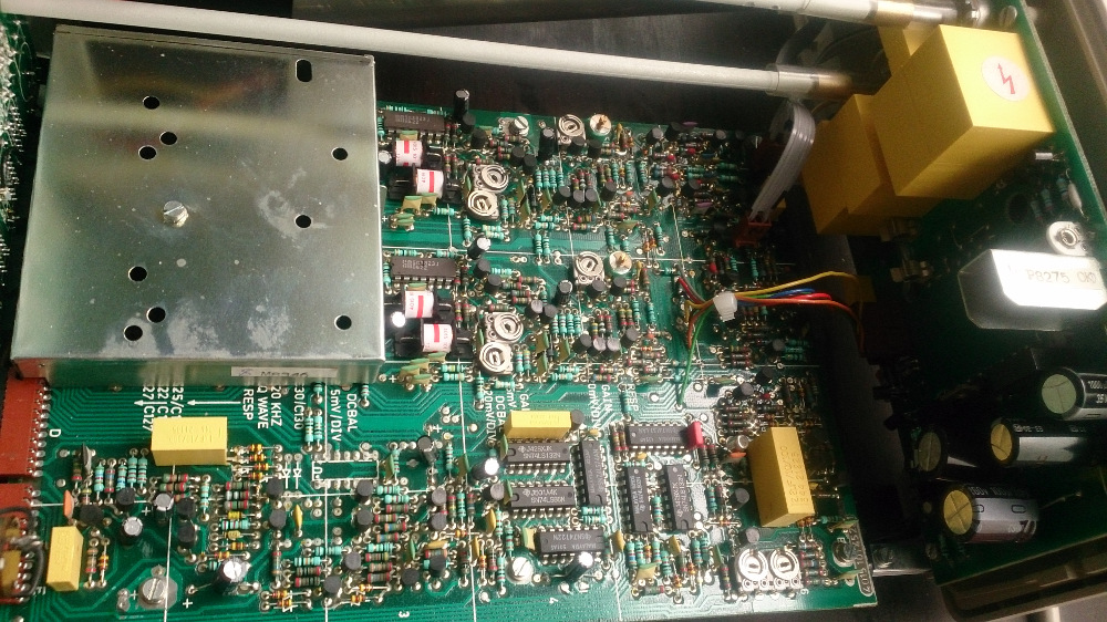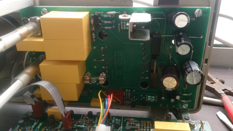 What I didn't know is that the disassembling (and later, the assembling, too) was a real nightmare. Even though I followed all steps from manual, I was unable to get the mains cable clamp loose without breaking it (so I had to glue it later, not very neat, but ended up fine), as it was impossible to get it done. I hate to work like this, but I had no choice, these oscilloscopes were from an entry line and not designed to be disassembled often, as the usual maintenance (like adjustments) could be done without unmounting the PCBs. But as I wanted to substitute all electrolytics, I had no alternative. In the end, I had them all done.
